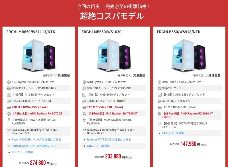 前述の例のようにフロンティアの決算セールでは「台数限定」のモデルも多く、セール対象となるPCが限られた数量で販売されるため、特に人気モデルや高スペックのゲーミングPCは早期に在庫切れになることが多いのでその点には注意です。
